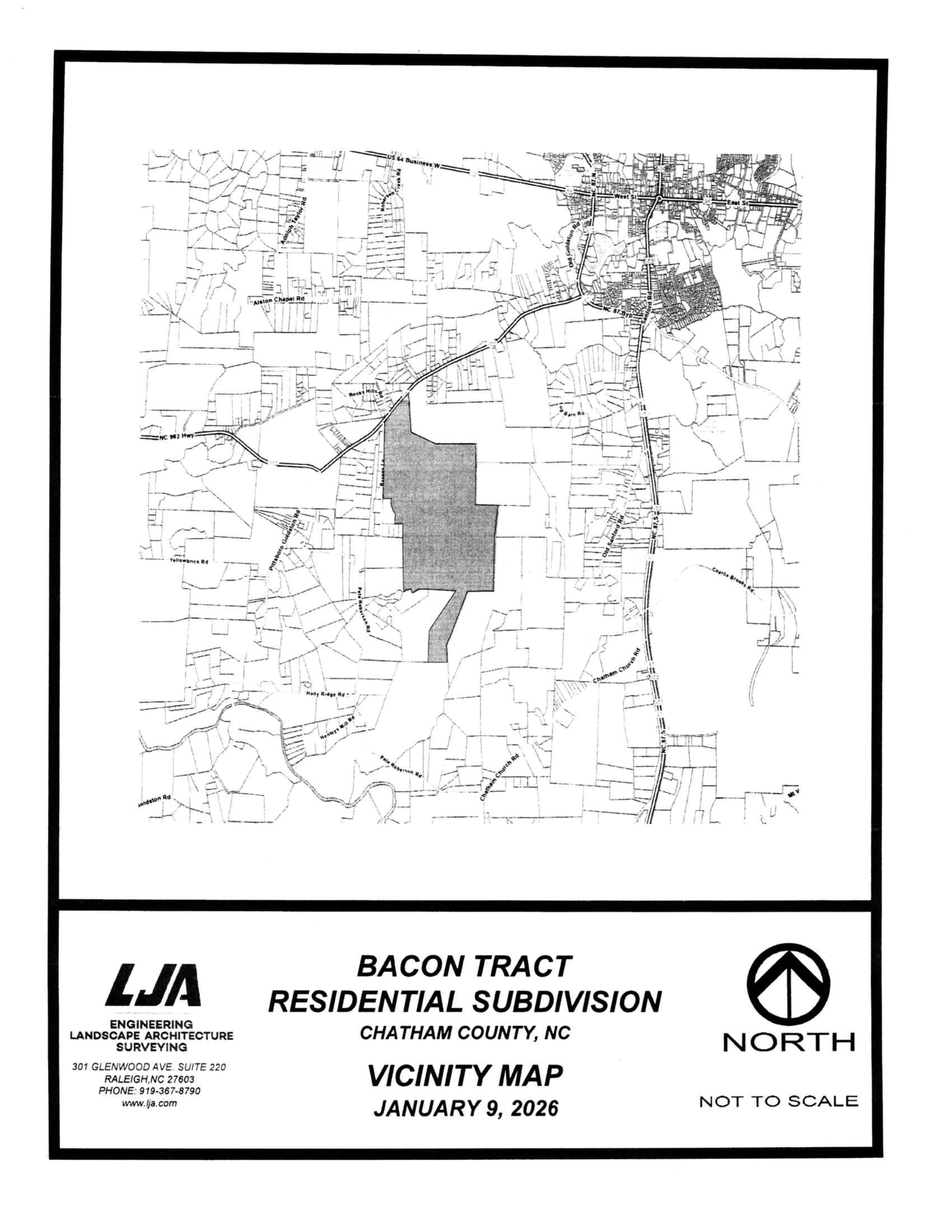 This letter is to invite you to a community information meeting regarding a Preliminary Plat Application for approval of a Conservation Subdivision preliminary plat for a tracts totaling approximately 690.2 acres, Chatham County Tax Parcel #s 7047, 94452, 06283, 92435(Portion of) and 85133 (Portion of) (collectively, the “Property”). The subdivision is currently anticipated to include approximately +1 145 detached single-family lots along with, among other things, a public park, amenities, walking trails an approximately 341 acres (undeveloped, active and public park).